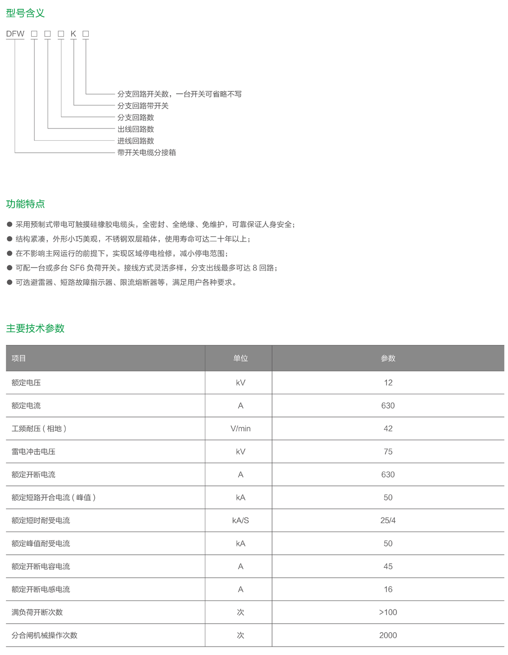 采用预制式带电可触摸硅橡胶电缆头,全密封,全绝缘,免维护,可靠保证人身安全;结构紧凑,外形小巧美观,不锈钢双层箱体,使用寿命可达二十年以上;在不影响主网运行的前提下。实现区域停电检修,减小停电范围;可配一台或多台SF6负荷开关。接线方式灵活多样,分支出线最多可达八回路;可选避雷器、短路故障指示器,限流熔断器等,满足用户各种要求。